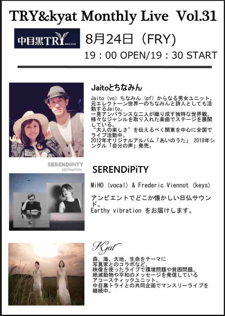 8/24(金)TRY&kyat monthly live vol.31 2018年08月08日 20:49 久しぶりのマンスリーライブ♪今回は3人でしっとりと?お届けします(^^)是非お集まりください! 「Live info」カテゴリの最新記事 < 前の記事次の記事 > コメント コメントフォーム 名前 コメント 評価する リセット リセット 顔 星 投稿する 情報を記憶